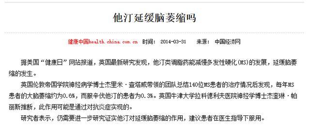 英国伦敦帝国学院神经病学博士杰里米·查塔威带领的团队曾经分析140名多发性硬化患者的治疗情况发现,服用辛伐他汀的患者比服用安慰剂的一组,脑萎缩速度减缓了将近一半。
